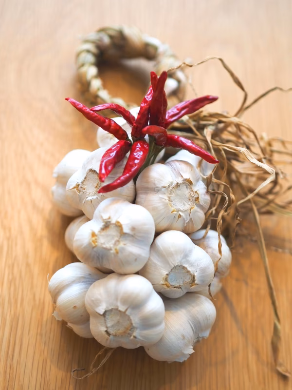 欧米では保存と魔よけの意味合いから、ガーリックブレイドをキッチンや玄関先につるしておく習慣があったようです。