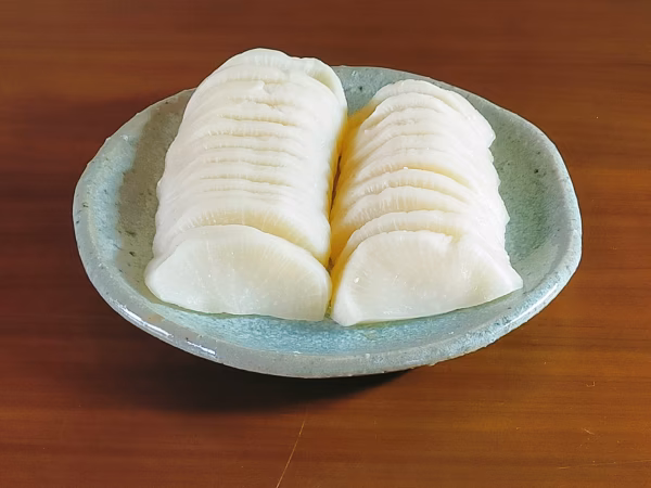この大根のたくあんは、独特の風味とシャキッとした食感が特徴です。食べるごとに広がる深い味わいが、どんなご飯とも相性抜群!お弁当のお供や、お酒のおつまみとしても大活躍します。毎日の食事にぴったりな一品です。