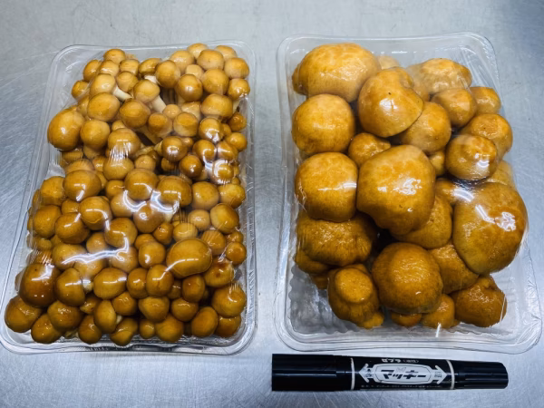 私たちはひとつの培地から2回なめこを収穫しています(通常は1回きり)。最初に採れるなめこは小粒のなめこが採れるのですが、その中でも特に琥珀色で色艶が良いなめこをクィーンなめこと呼んでいます。そして1番なめこの収穫後、2回目に採れるなめこは1番なめこよりも大きく育ち、その中でも特に大粒で軸の太いなめこをキングなめこと呼んでいます。クィーンなめこはヌメリが強くコリコリした食感が味わえ、キングなめこはクィーンなめこよりも香りが強く、より天然物に近い地味深い味が特徴です。