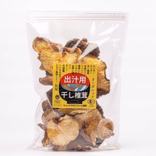 ▼商品概要 〇商品名:【熱湯90秒でもどる】かつお節みたいな極薄干し椎茸『なば節』 /12g ・生産地:宮崎県美郷町渡川地区 ・特徴:原木栽培、自然栽培、有機JAS認証取得、熱湯90秒でもどる ・商品内容:驚きの「熱湯90秒」でもどる極薄スライスの干し椎茸。       味噌汁やスープを食べる直前に入れても戻ります。       インスタントスープにも対応。簡単に干し椎茸をお料理に。 ▼品種・味の特徴 優れた加工食品を表彰する「2023みやざきフードアワード」にて最多3つの審査員を受賞したのがこの『かつお節みたいな極薄スライス干し椎茸「なば節」』 通常3㎜でスライスされるスライス干し椎茸を、手作業で1㎜の極薄スライスに仕上げる事で、驚きの「熱湯90秒で戻る干し椎茸」を実現しました。 戻すのに時間が掛かる干し椎茸の不便さを解決する令和の新商品です! もちろん有機JAS認定を受けたオーガニックな原木干し椎茸を使用しています。 〇商品名:【大容量お買い得】オーガニック出汁用干し椎茸/130g ・生産地:宮崎県美郷町渡川地区 ・特徴:原木栽培、自然栽培、有機JAS認証取得 ・商品内容:割れたり色が悪い干し椎茸です。       大容量でお得な商品。出汁用にどうぞ。       見た目は気にせずご家庭やお店で沢山使いたい方に最適です。       有機JAS認証を取得したオーガニック原木干し椎茸です。 ▼品種・味の特徴 ヒュッテきのこファームの『オーガニック出汁用干し椎茸』は安くで沢山入っているので、日々のお料理で沢山使う方にぴったりです♪ お出汁用にはもちろん、戻した椎茸もしっかり美味しく食べられます♪スープやポタージュなど洋風料理にもぴったり♪ハンバーグの具材に足したり、パスタに刻んで入れたりと手軽に原木しいたけを楽しんで頂ける商品です。 ▼数量、分量の目安 「見た目は気にしない!安く沢山使いたい!」という方にピッタリな130g入り。ジップ付きなので保管しやすく使いやすい。湿気が大敵な干し椎茸の保存にも適しています。 ▼栽培/生産方法、こだわり 原木きのこ専門店「ヒュッテきのこファーム」は九州山脈に位置する宮崎県美郷町渡川(どがわ)地区で、日本古来からの原木栽培にこだわってオーガニック原木干し椎茸を栽培しています。 厳正な基準で審査され、有機的管理を行っている農場にのみ与えられる「有機JAS認証制度」を取得しており、安心安全な環境で生産され、無農薬・無添加で栽培している「オーガニック」が証明されています。 日本で2番目の原木しいたけ生産地の宮崎県でも取得している農家は数少ない中、ヒュッテキノコファームは2020年に有機JAS認証を取得しました。 自信を持ってオーガニックで安心安全な椎茸を皆様にお届けします。 【椎茸の原木栽培とは?】 「椎茸」とは本来「木」から採れるもの。木から採れるから「木の子(きのこ)」と言われています。 現在日本で流通している生椎茸のほとんどが「菌床椎茸」と言われる、工場で作られる椎茸です。栄養剤を添加したり、時には殺菌剤を使うことで年中安定して生産しています。 「原木椎茸」とは椎茸の本来の形で栽培する方法。秋に伐採した原木(シイ・クヌギ・ナラ等)に椎茸を植菌し、1年半の間山に寝かせ、約2年かけて収穫する日本古来の栽培方法です。木の養分だけで育つので濃厚な木の香りと旨味が特徴の本物の椎茸です。スーパーに売ってある菌床栽培の椎茸とは味も香りも食感も比べ物になりません。 干し椎茸にしても外国産の干し椎茸とは別格の旨味を持ちます。現在日本で消費される干し椎茸の内、約8割が輸入された外国産の椎茸です。実は原木栽培の国産干し椎茸は2割を切ろうとしています。つまり日本が誇る日本の椎茸出汁文化は絶滅危惧種なのです。 ヒュッテきのこファームはこの「原木栽培」「原木椎茸」にこだわり、日本の原木椎茸、そして世界に誇る日本の「出汁文化」「和食」を守り続けます。 ▼注文に際しての注意点(配送方法や納期指定など) ご注文頂いてから2~3日、時には1週間程度頂いてからの発送となります。農作業と並行して発送作業を行っておりますので、ご了承下さい。