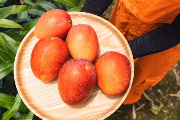 果実は300~500g前後の卵型。果皮は赤く、果肉はオレンジ色。マンゴーには酸味が強い品種や酸味のない品種もありますが、アーウィンは甘味が強く、適度な酸味も含んでいて、世代を問わず好まれています。