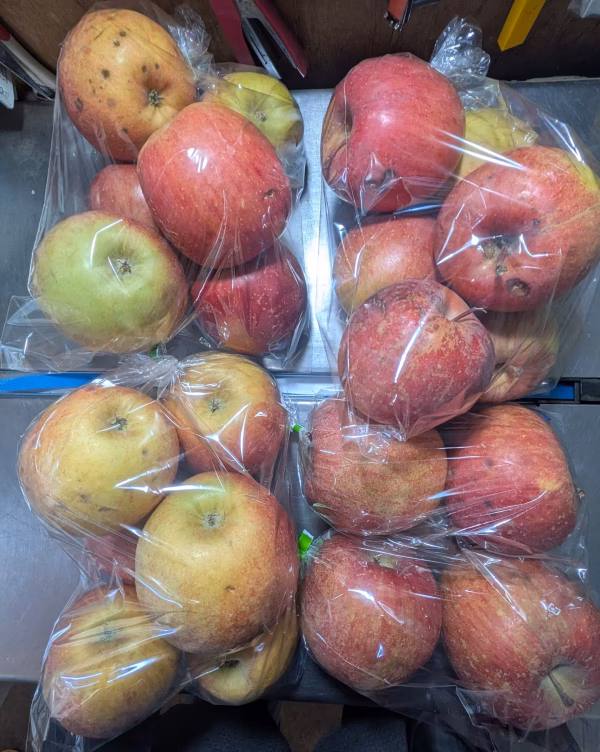 ふじリンゴの3Lサイズと4〜5Lサイズの袋詰めのサイズ混合です。着色不良やキズや割れ、黒い斑点等があります。家庭用の商品ですが、糖度は15〜17度程度あります。蜜は入っておりませんが、サクサクの食感です。
