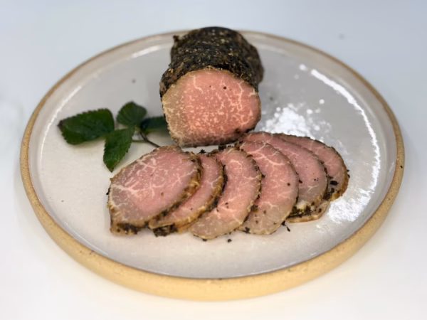 解凍して食べられる里山牛オリジナルのパストラミビーフをご用意いたしました。爽やかなバジルの香りと里山牛の旨味が口の中いっぱいに広がる一品です。冷蔵庫で解凍後、お好みの厚さにカットしてサンドイッチやサラダのトッピングやお酒のおつまみにおすすめです。ぜひお楽しみください♪