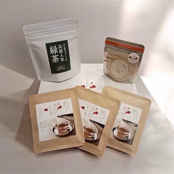 ▼商品概要 高麗人参乾燥物 ▼品種・利用シーン ●緑茶はお家や職場でちょっと一休み。夏は冷たくして水筒に入れて持ち運び水分補給に元気をプラス、寒い時は身体を温めて手足の冷えを改善してくれます。身近にある緑茶は飲みやすく感じると思います。 ●TEAPACKはコーヒー、紅茶を飲むようにゆっくりと優雅に味わってみてはいかがでしょうか。少し長めにお湯に浸けていただくとしっかりとした味の高麗人参とほうじ茶を楽しめます。 ●高麗人参塩は普段お塩を使われているのと同じように食卓や台所に 置いて頂き、お料理の煮物、焼き物の調味料として、お肉や野菜にふり 掛けてなどに使って頂き、毎日少しづつ摂り入れていただくことで お塩と、高麗人参の栄養とwで摂取できます。 ▼数量 ・数量1セット(161.9g) ・分量  高麗人参緑茶7包×1(7g) ・高麗人参TEAPACK2.5g×4(10g) ・高麗人参塩30g(30g) ▼栽培/生産方法、こだわり 土ではなく水の中で育ちます。錦鯉の水槽で出た排泄物を、バクテリア槽で分解し、栄養のみ残した水が高麗人参の水槽に届きます。つまり、生産性と環境配慮を両立した次世代の循環型農業です。 《商品特徴》 高麗人参×緑茶、高麗人参TEAPACK、高麗人参塩 3種類をギフトセットにしました。 日頃大切に思っておられる方へ、ギフトにして大事なイベント事などの時に贈ってみませんか。何時までも元気でいて欲しい気持ちが十分伝わる品になりそうです。もちろん自分へのご褒美として日々の疲れに癒しを与えてくれそうです。