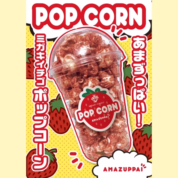 東京の一流百貨店で高い評価を受けているミガキイチゴをピューレにし、ポップコーンに混ぜ込みました!