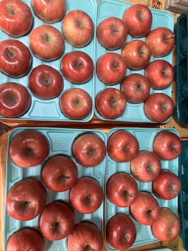 伝票来ましたらなるべく早く発送します! 大玉3キロ7-9玉入‼️ 今の時期からは、蜜入しているサンふじは、蜜入部分が茶色くなる内部褐変が出てくる場合があるので、日持ち重視で、蜜入が微妙なサンふじです。 樹上完熟してから収穫してるので、蜜入は微妙ですが、まだまだシャキシャキで美味いサンふじです。 農薬半減栽培です。過去6年間で、りんご主要病気である黒星病などがほとんど出てないため、チャレンジしました😊 通風採光を良くすると病気なども防げるため、剪定も工夫しました。また、病気になったかもしれない落ち葉も地中にすき込み、病原菌が雨などで、飛ばないようにもしました。 病気などはあまり出ませんでした。 葉っぱの力を活かすために極力自然に任せて、自然と葉が落ちるまで、ギリギリまで成らせた樹上完熟サンふじです。 11月終わりから12月初めにかなり遅く収穫したりんごを🍎選び発送します。 味は美味しくなり、食べたらめっちゃ美味い😋ジュース分もより入りやすくなります。 葉取らず栽培のため色むらはありますが、減農薬栽培のため、見た目より、美味いサンふじの本来の味をお楽しみたい方は、ご検討いただけたら嬉しいです😆 収穫をかなり遅らせているので微細なキズや、軸が少しだけ割れたりします。葉取らず減農薬栽培のりんご🍎を詰めて発送します。微細なキズや割れはご容赦ください。 なお、基本的には、今年度のJAさくらんぼ東根の防除歴を参考にして農薬散布をしていますが、標準よりも散布回数や、濃度を薄くしております。 例2000倍希釈→4000倍希釈 農薬使用量が半分になるということです。標準防除歴より回数削減、および濃度も全て適用範囲内で1番薄くかつ散布量も約60パーセントに抑えております。 写真で赤くしたのは使用していない目印です。 ご検討よろしくお願いします😊