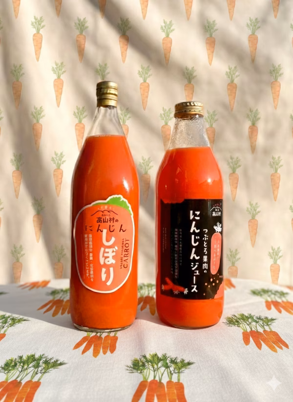 - 高山村のにんじんしぼり 原材料名:人参(高山村産)/クエン酸 つぶとろ果肉のにんじんジュース 原材料名:人参(高山村産)・国産レモン
