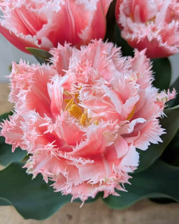 明るいコーラルピンクの八重のフリンジ咲き品種です。
