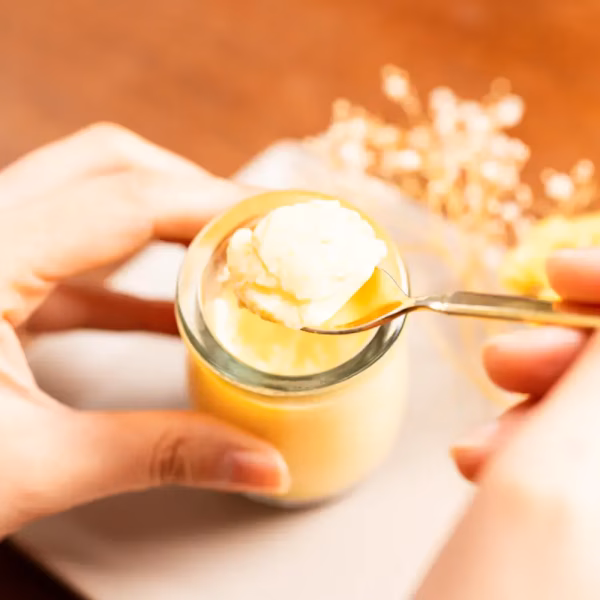 ジャージー牛は、一般的な乳牛に比べて年間の搾乳量が少なく、非常に希少価値が高いのが特徴です。そのミルクは濃厚でビタミンやカロテンを豊富に含み(ホルスタイン種と比較して約3.5倍の27μg『日本食品標準成分表2020より』)、淡い黄金色を帯びていることから「ゴールデンミルク」とも呼ばれています。この濃厚なミルクを使用することで、しっかりとした質感の中にも、とろけるような乳脂肪の旨味が広がるプリンに仕上がりました。