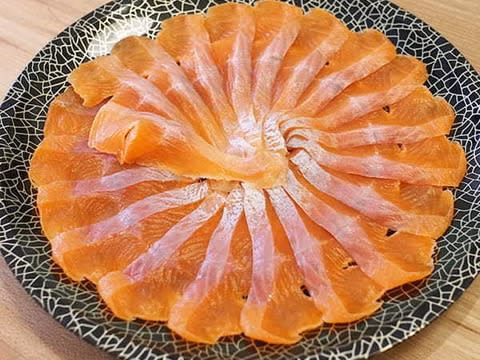 弊社養魚場でじっくり丁寧に育てた鮮やかな身が特徴の白山べに鱒(ニジマス)のすし酢〆です。虹鱒(ニジマス)はアトランティックサーモンなどに比べさっぱりとした上品な脂が特徴です。
