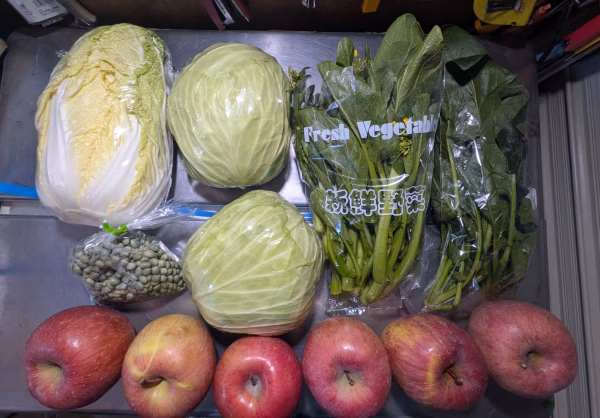 野菜類は低温貯蔵したものです。リンゴはふじですが、キズや割れ黒斑模様等があります。