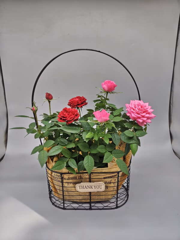 華やかな2色の【コルダナローズ】を手付きの可愛いブリキバスケットに飾ったミニバラの商品です♪