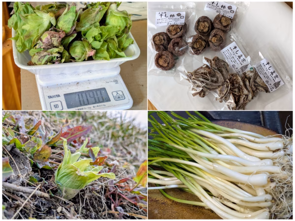 ふきのとう150g、あさつき100g、干し柿4個入り2袋、干し孟宗20g2袋。ふきのとう、あさつきはスーパーや産直などで見かける1袋分の2倍位の量だと思います。