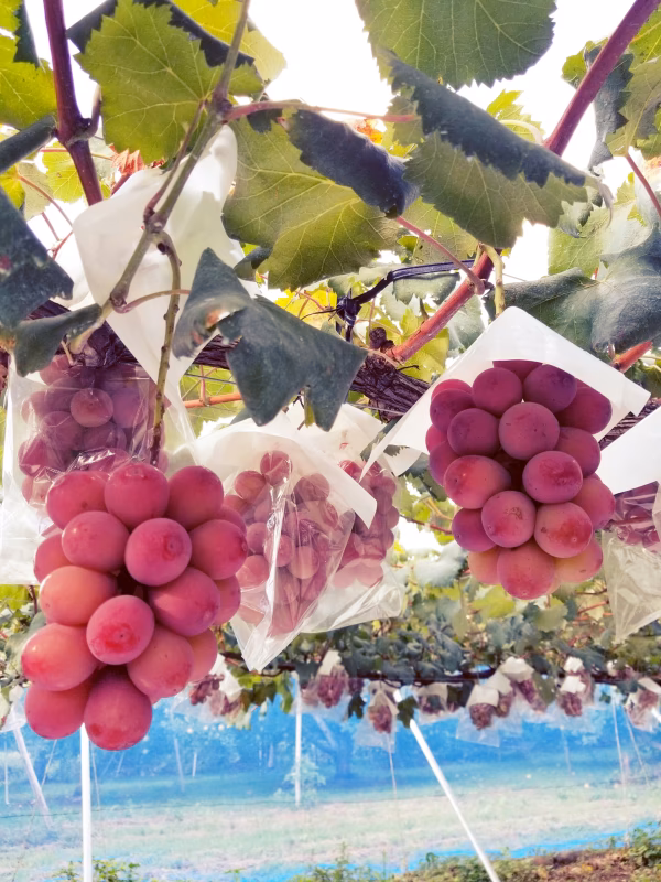 ◆綺麗な赤系の色を出すことが非常に大変な品種です。欲張って沢山の房や粒を着けると綺麗な色にならないことが多いので、着果量を抑えて、太陽の光を沢山浴びさせる必要がある品種です。そのため、8月後半に反射シートを敷いたり、通常の袋を外し透明袋に入れかえ、房の上の葉(副梢)を落としたりして、房に光を沢山浴びさせて綺麗な赤を作ります。