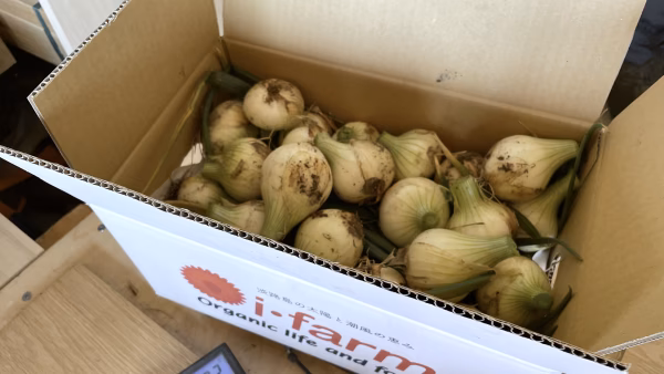 アイ・ファームの長年農薬化学肥料除草剤を使わず有機栽培のみで肥えた土壌に、タネから育てた苗を植え付け、半年掛けて丹精込めて育てた新玉ねぎです。大量生産しないで自然で安心・安全な玉ねぎを毎年作っています。