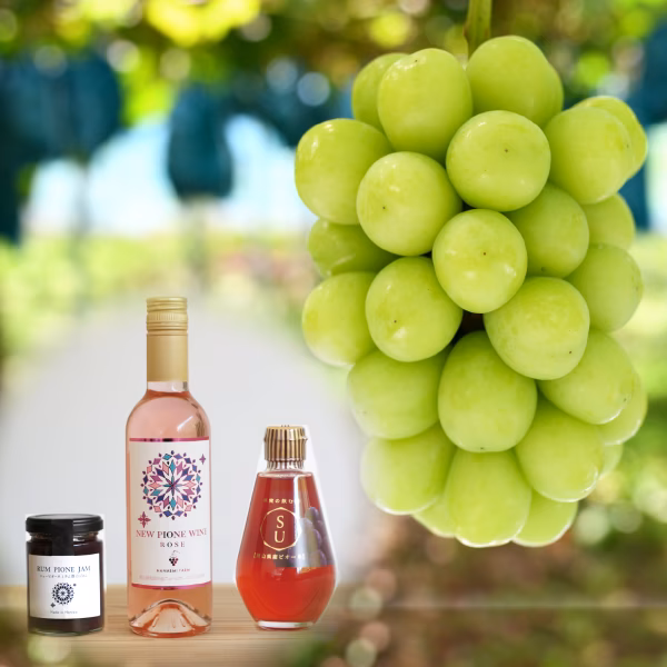 この商品は、花笑み農園で人気がある、シャインマスカットとラムピオーネジャムとピオーネワインと飲む酢のセットです。シャインマスカット1房とラムピオーネジャム1本とピオーネワイン1本と飲む酢ピオーネ1本入りでお届けいたします。