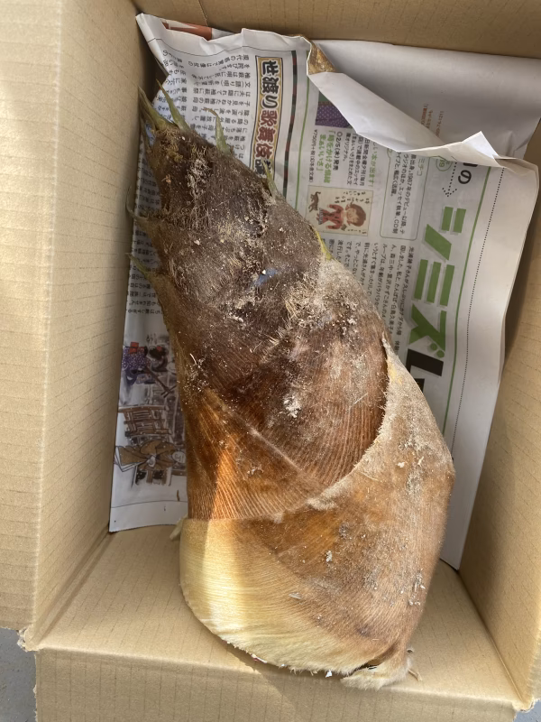 写真1枚目は1kgのタケノコ1本で60サイズの段ボールに入れた様子です。