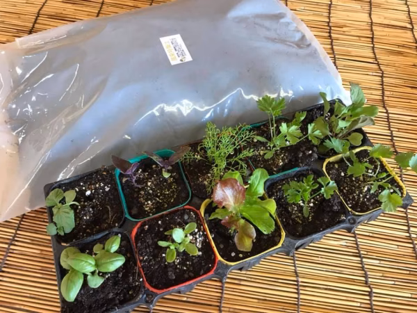 さらに風来特製配合の土(殺菌剤不使用)をセットにしました。お好きなプランターを用意して育ててくださいね(1苗につき500㎖の土があれば収穫までできます)