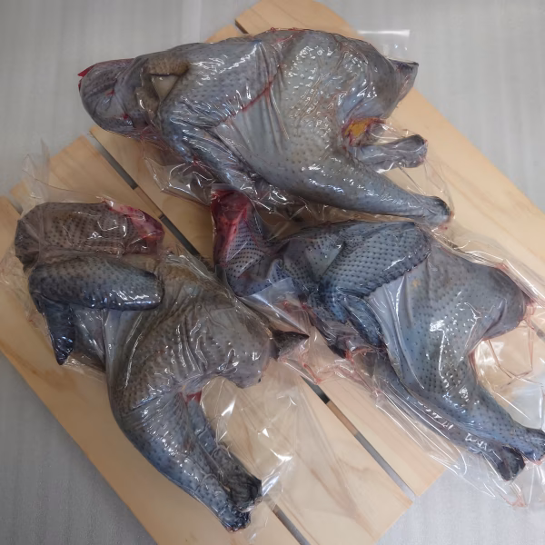 スープやお粥作りに使う烏骨鶏×アローカナのハーフの丸鶏となります。