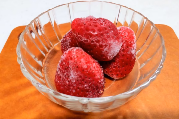 完熟イチゴをヘタを取って水道水を掛け流し後に冷凍しています。