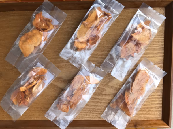 畑のそばのかきを機械乾燥(熱風乾燥)しただけです。干し柿でもなく、パリパリでもない、噛めば噛むほど美味しくなります。