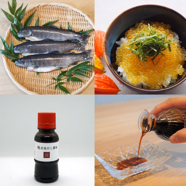 内臓処理済みのイワナ5尾と岩魚の輝イクラ(120g)1個に専用の焼岩魚だし醤油(50ml)が付いたのセットです。