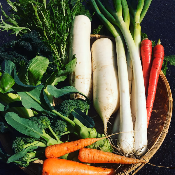 大山の麓で育てた野菜です。黒ぼく土の畑で、農薬、肥料を極力使わずに育てた、採れたての旬野菜のセットです。