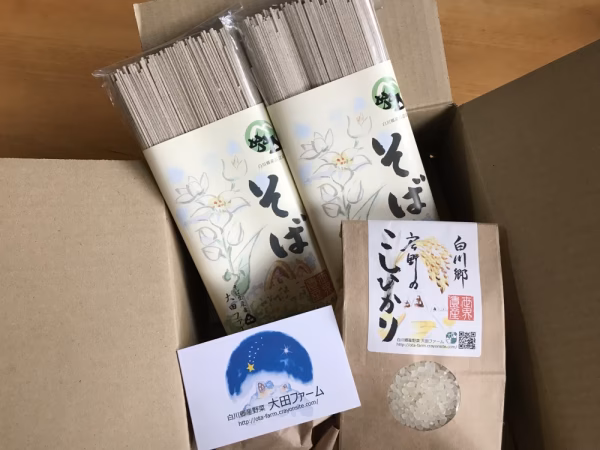 白川郷産そばの実の干しそばとミニサイズのお米をセットにしました。