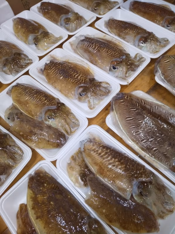 紋甲イカ、甲イカの下足は半々位にいれます ミミをおまけで入れます ビニール袋に入れさせて頂いています