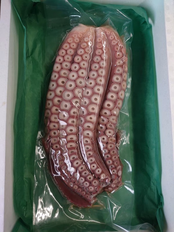 タコ箱漁で水揚げされたタコを即浜茹でし、真空パックをして急速冷凍しています。