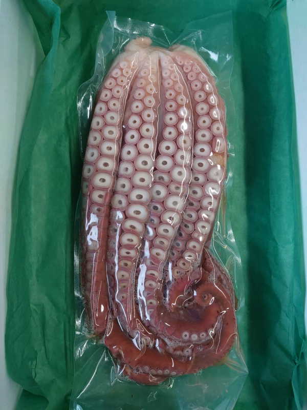 タコ箱漁で水揚げされたタコを即浜茹でし、真空パックをして急速冷凍しています。