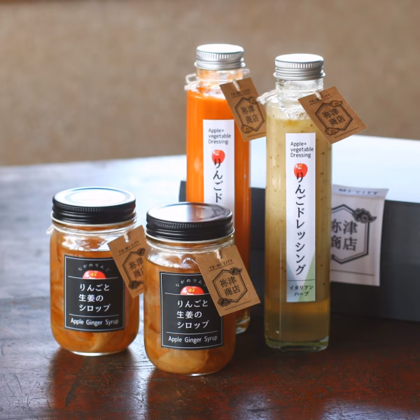 - ・りんごドレッシング/イタリアンハーブ 原材料名:りんご(長野県産)、植物油、醸造酢、玉ねぎ、塩、砂糖、にんにく、バジル、オレガノ、胡椒 内容量:150ml 賞味期限:製造日から6カ月 保存方法:冷暗所で保存 ・りんごドレッシング/ガスパチョ 原材料名:りんご(長野県産)、トマト、セロリ、植物油、醸造酢、玉ねぎ、塩、にんにく、砂糖、醤油(大豆を含む) 内容量:150ml 賞味期限:製造日から6カ月 保存方法:冷暗所で保存 ・りんごと生姜のシロップ 原材料名:りんご(長野県産)、てん菜糖、生姜、醸造酢 内容量:130g 賞味期限:製造日から6カ月 保存方法:冷暗所で保存