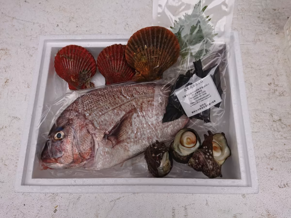 ①真鯛1尾(内臓 うろこ処理済み)塩 アラメor昆布 大葉 アップ貝 3個 サザエ3個