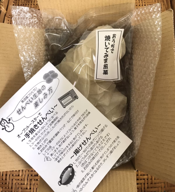 ご家庭でおせんべいが焼ける体験生地をお届けします。こちらの生地は魚沼産コシヒカリ「惣五郎」100%のこだわりの生地です。
