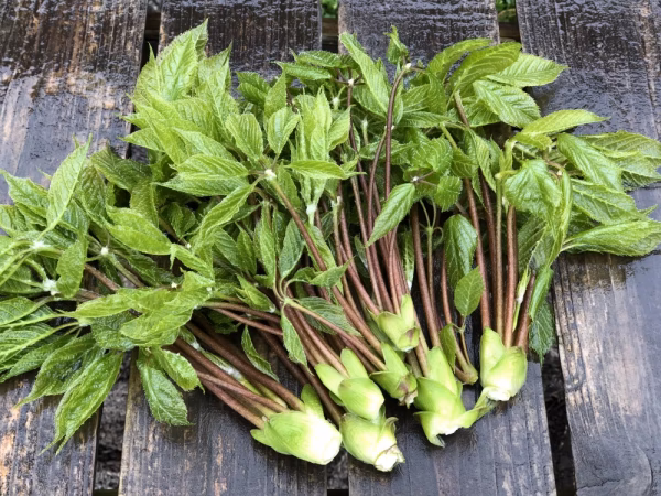 アクは少なく、根元部分はコリッとした食感、葉はセリのようなほろ苦い風味を持っています。かつてこの木の樹脂を絞って、濾したものを漆のように塗料として使われていたことから、こしあぶら(濾油)と呼ばれているようです。