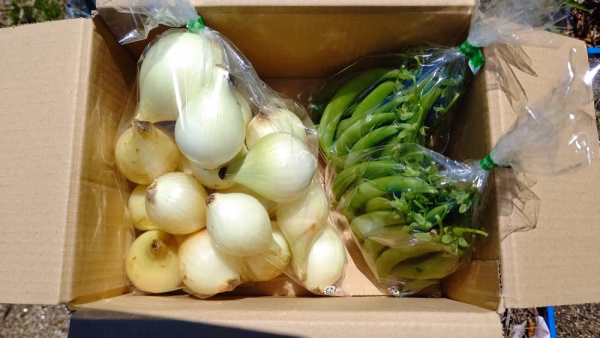 玉ねぎはピンポン玉サイズから野球ボールサイズ、スナップエンドウは粗選別になります!