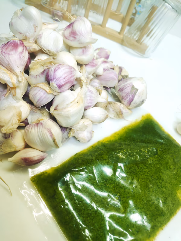 今年収穫したばかりの「にんにく」500gと「バジルソース」100g1パックのセットです。