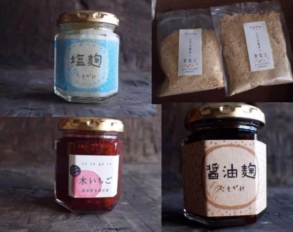 祖父母が育てた木イチゴから作ったジャムと耕さない田んぼで農薬・化学肥料を使用せずに育てたお米から作った塩麹と醤油麹です。