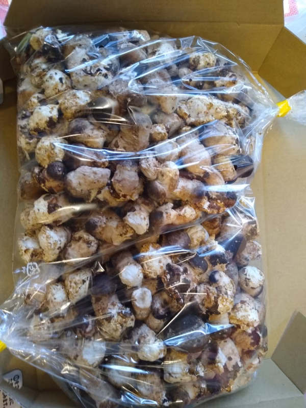 ③椎茸は農業用ポリ袋に入れて発送します。椎茸は呼吸するので霜がつく場合がございます