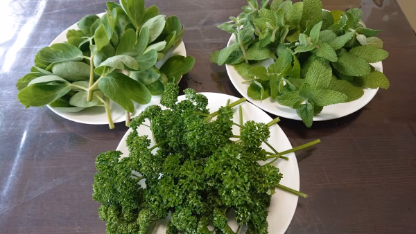 ・パセリ:栄養価は極めて高く、多くのビタミン、ミネラルも野菜の中でも屈指である。他にも食物繊維、葉緑素、カリウムなども含む。