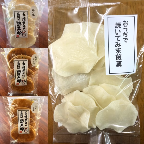 人気の3種類(ほの塩、ゆず七味、あおさたまり)と、おうちで手焼きせんべいを体験できる生地をセットでお届けいたします。