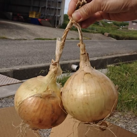 ▼収穫仕立ての乾燥前の玉ねぎを、お客様のお手元に届いてから日持ちさせるために、ツル(15cmくらい)と根付きのままお届けいたします。