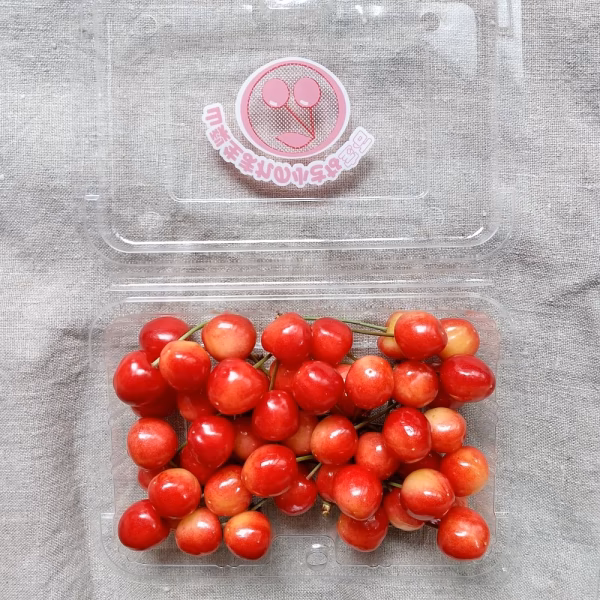 品種:高砂または佐藤錦で、パックに品種ラベルを貼っています。