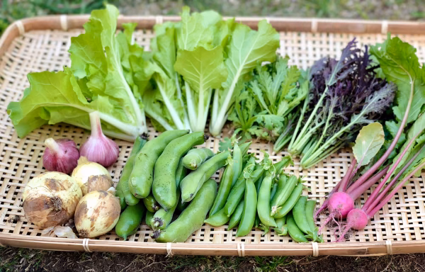 千葉県南房総市より、旬を迎えた「そら豆」をお入れして、葉物野菜が4種類前後、赤皮ニンニク、ミニ玉ねぎ、グリーンピースやスナップえんどうも入った調理もワクワク楽しめる無農薬野菜セットです。肥料は米ぬかなどの植物性有機肥料のみを使用しております。