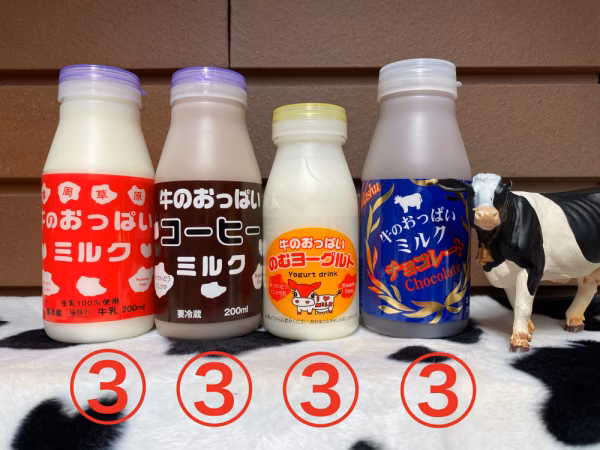- 牛のおっぱいミルク200㎖×3本、コーヒー200㎖×3本、、チョコレート200㎖×3本、ヨーグルト150㎖×3本 冷蔵で10℃以下で保存 賞味期限 ミルク8日、コーヒー9日、ヨーグルト15日、チョコ9日