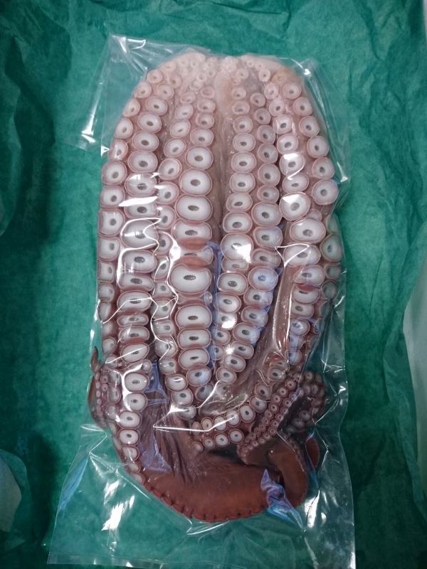 タコ箱漁で水揚げされたタコを即浜茹でし、真空パックをして急速冷凍しています。