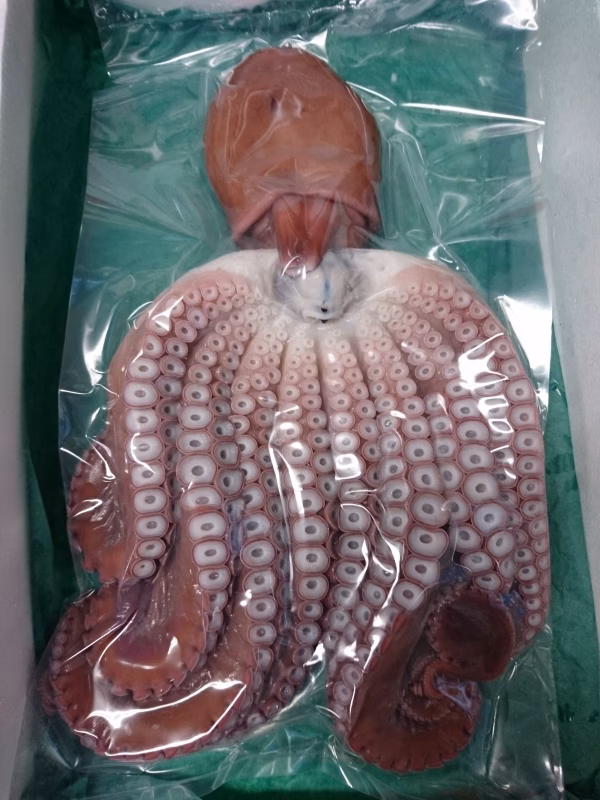 タコ箱漁で水揚げされたタコを即浜茹でし、真空パックをして急速冷凍しています。