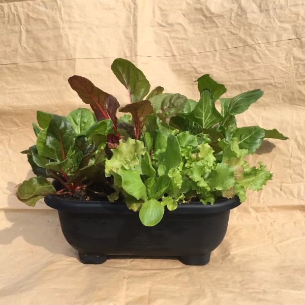 こちらの商品は3~4種類のベビーリーフレタスとスイスチャード6株を寄せ植えにしました。のんびり育てつつ新鮮サラダが楽しめます。