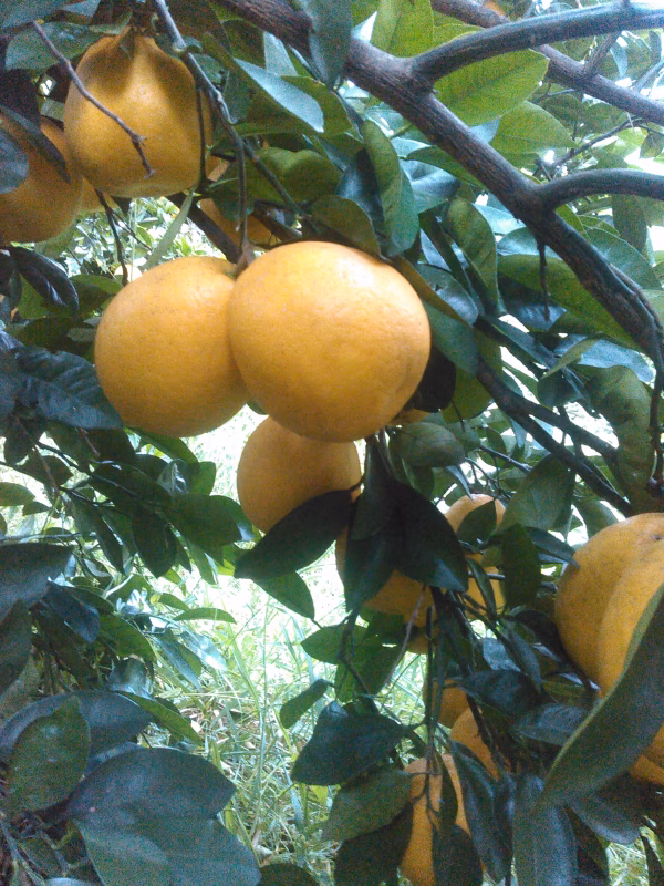 太陽の光をたっぷり浴びた河内晩柑です。河内晩柑は生産地によりジューシーオレンジ、美生柑、宇和ゴールド、灘オレンジなどいろいろ呼ばれています。外見から和製グレープフルーツとも呼ばれています。グレープフルーツのような苦味もなく、さっぱりした味が特徴です。
