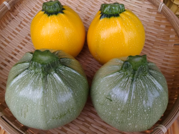 こちらの商品では、丸い形のズッキーニを、緑色(オリーブ)と黄色(ジャッロ)の2色をセットにしてお届けします。